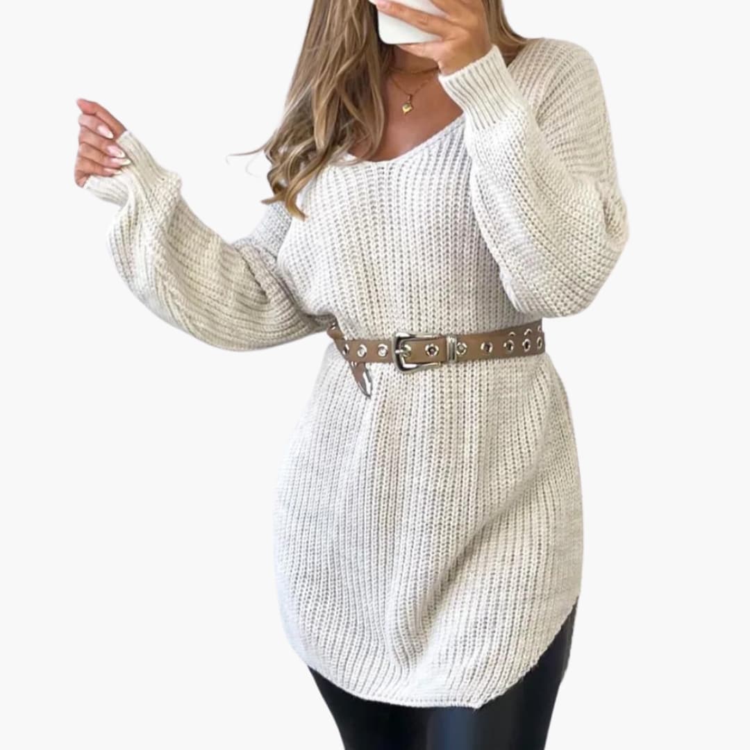 Dlouhý dámský svetr z úpletu s výstřihem do V a dlouhými rukávy.