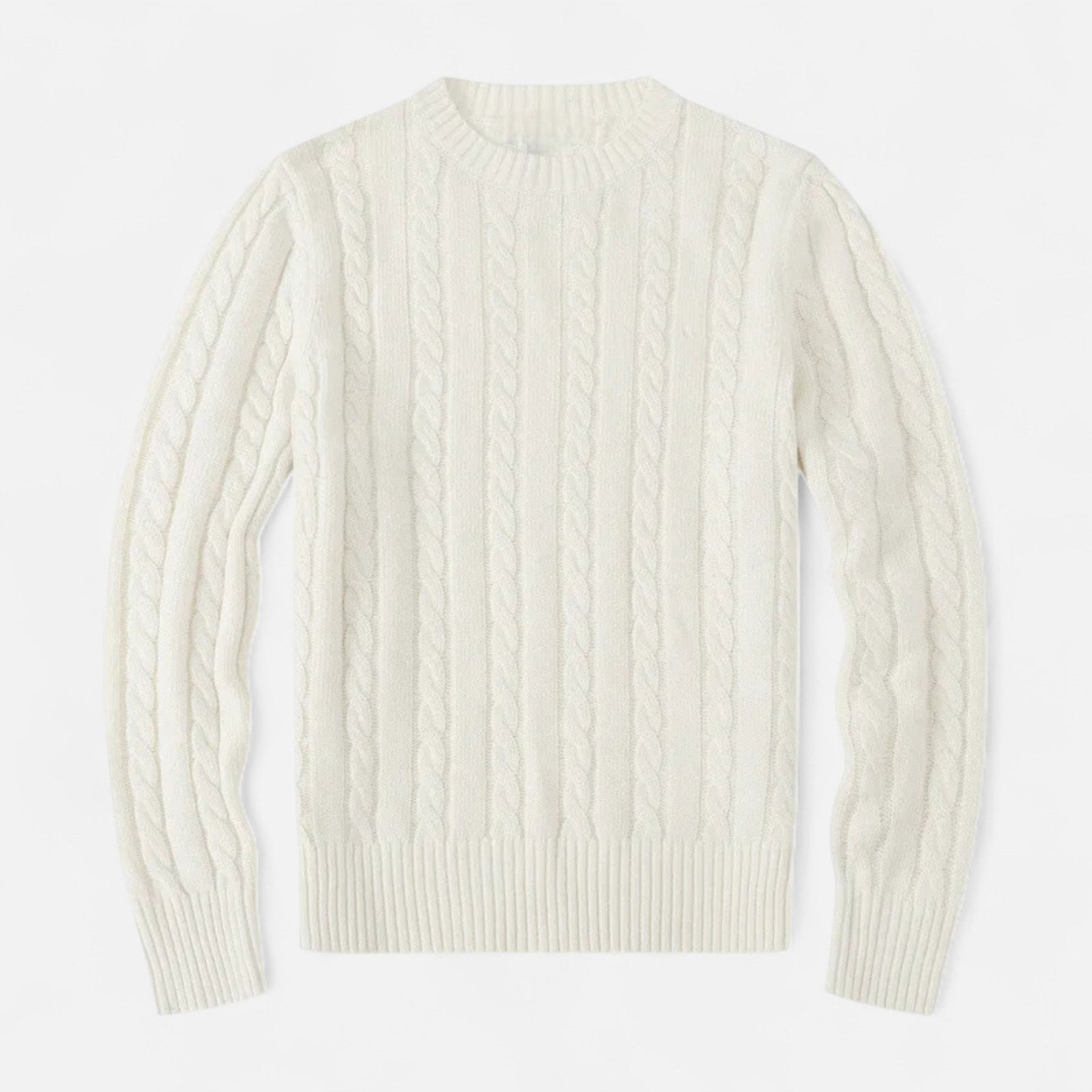 Pull en laine torsadée blanc cassé, manches longues, col rond. Style classique et élégant, idéal pour l&