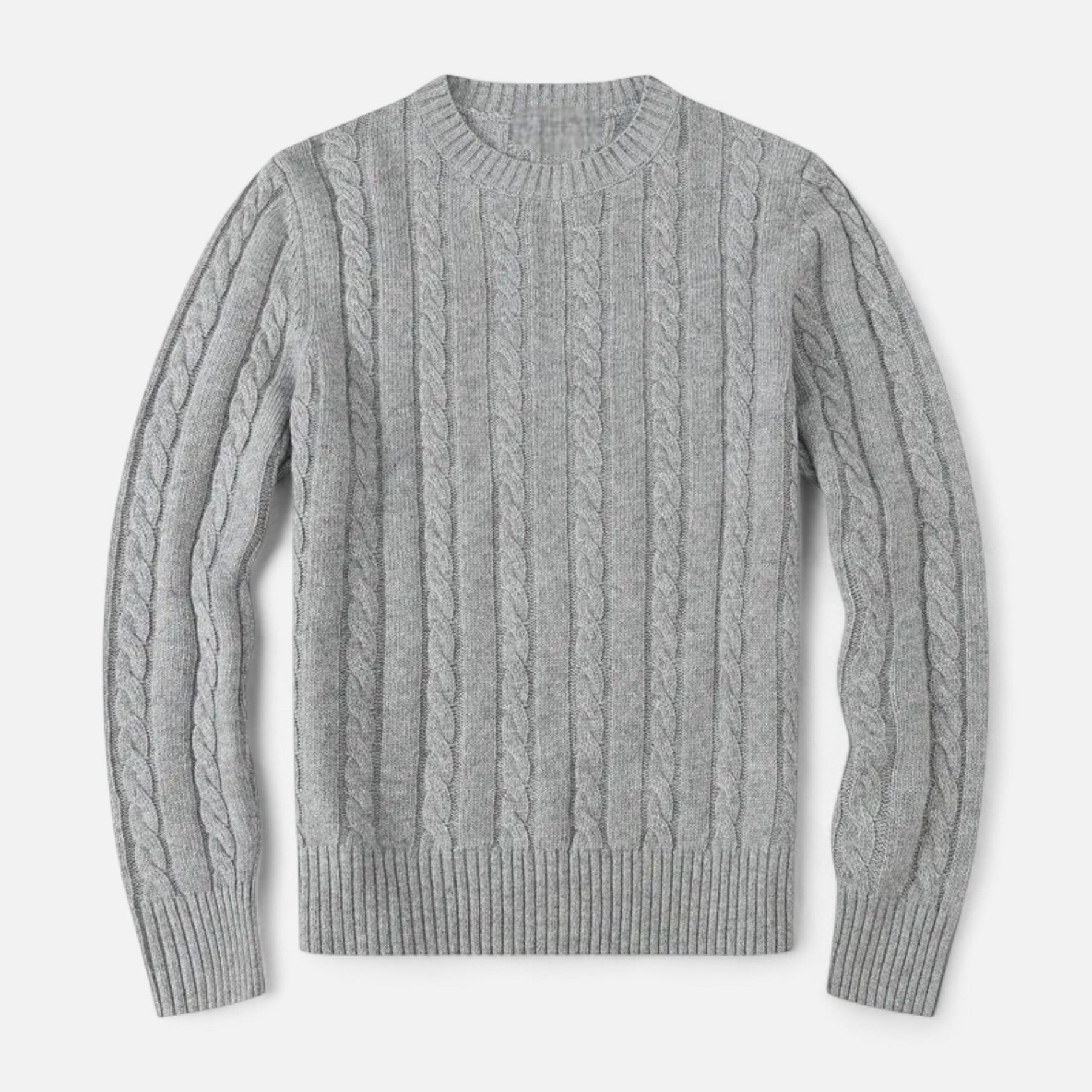Pull en laine torsadée gris clair, col rond, manches longues, style classique. Vêtement chaud et élégant pour l&